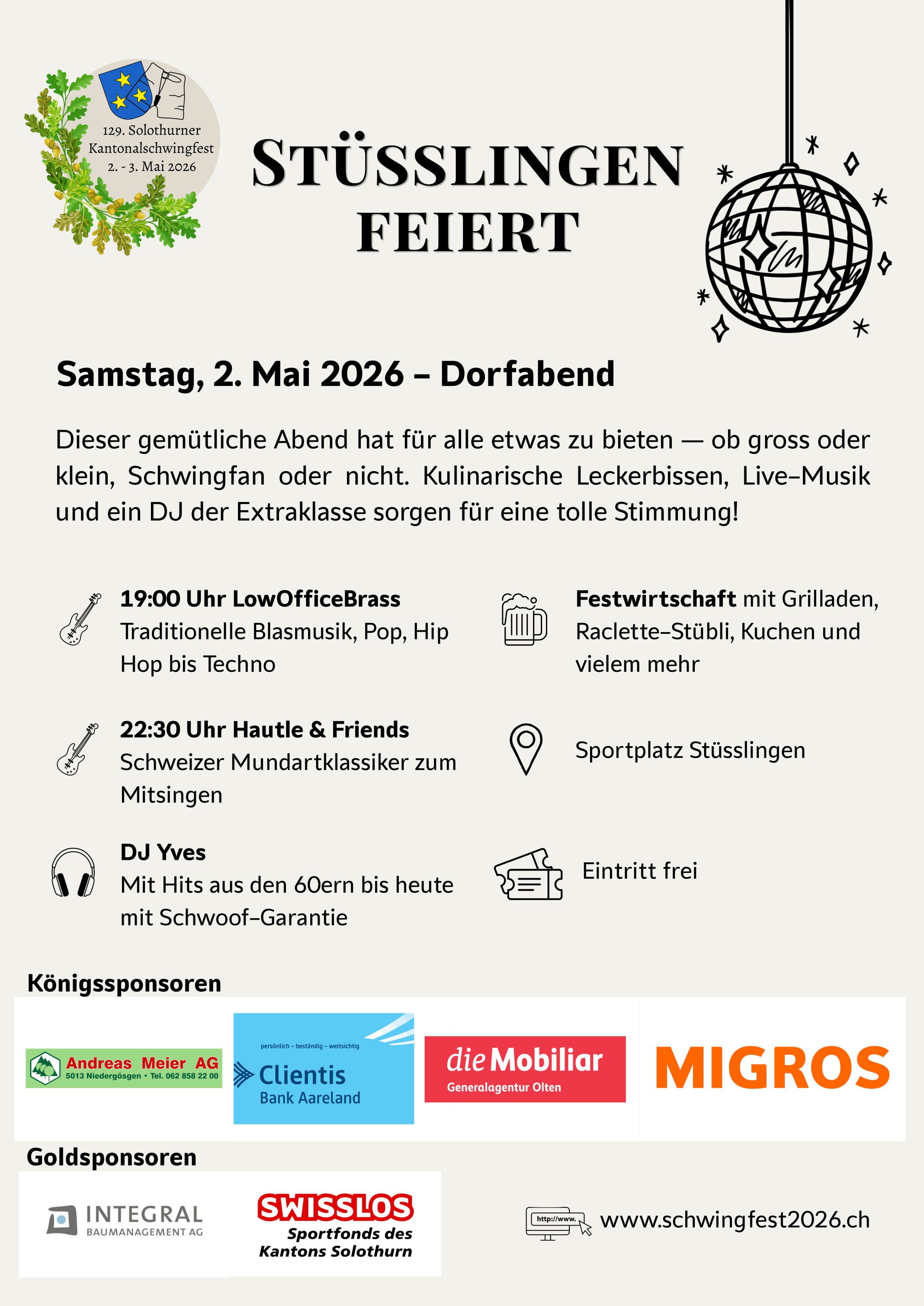 Herzlich willkommen zum 129. Solothurner Kantonalschwingfest! Wir freuen uns, Sie schon bald in Stüsslingen begrüssen zu dürfen.